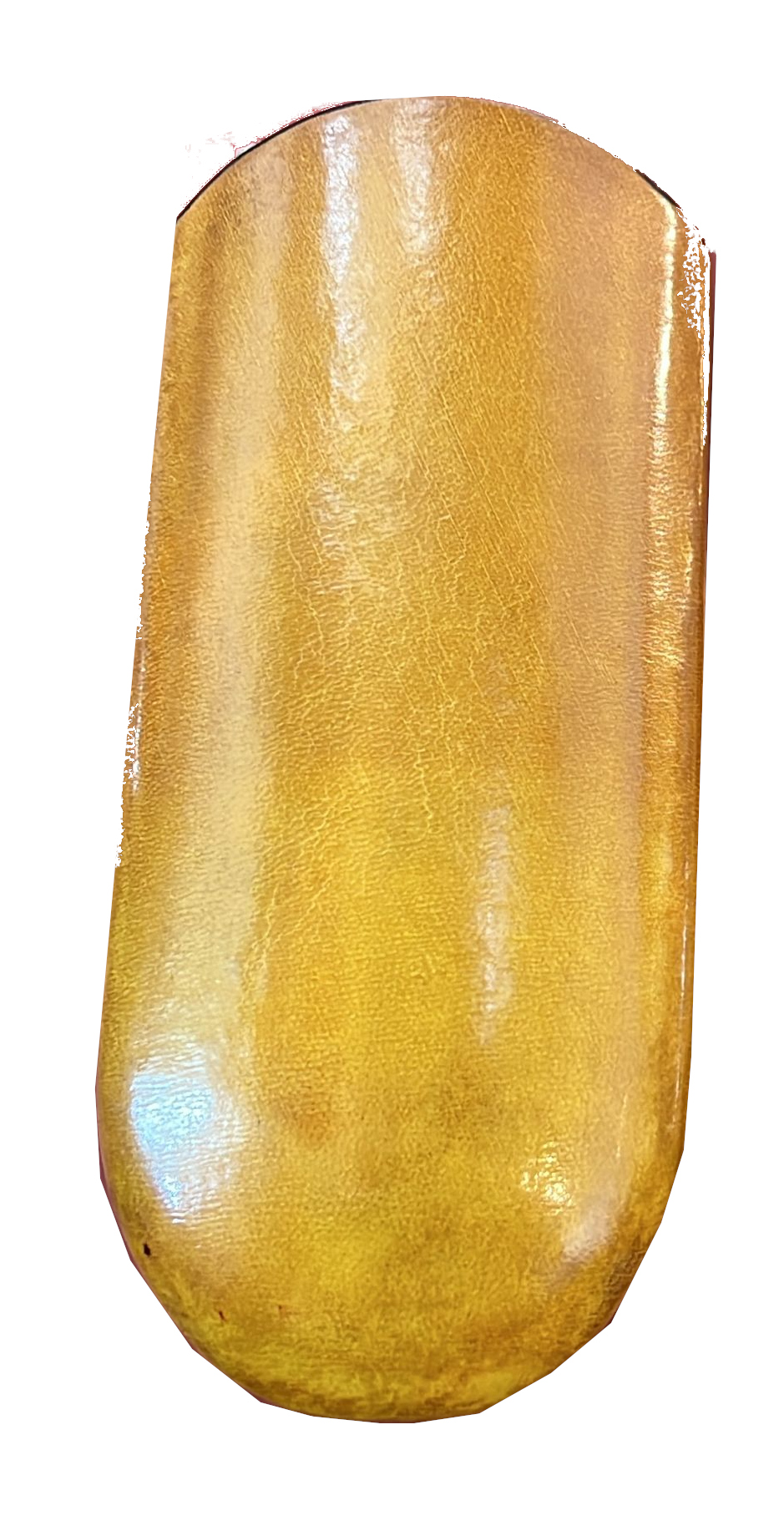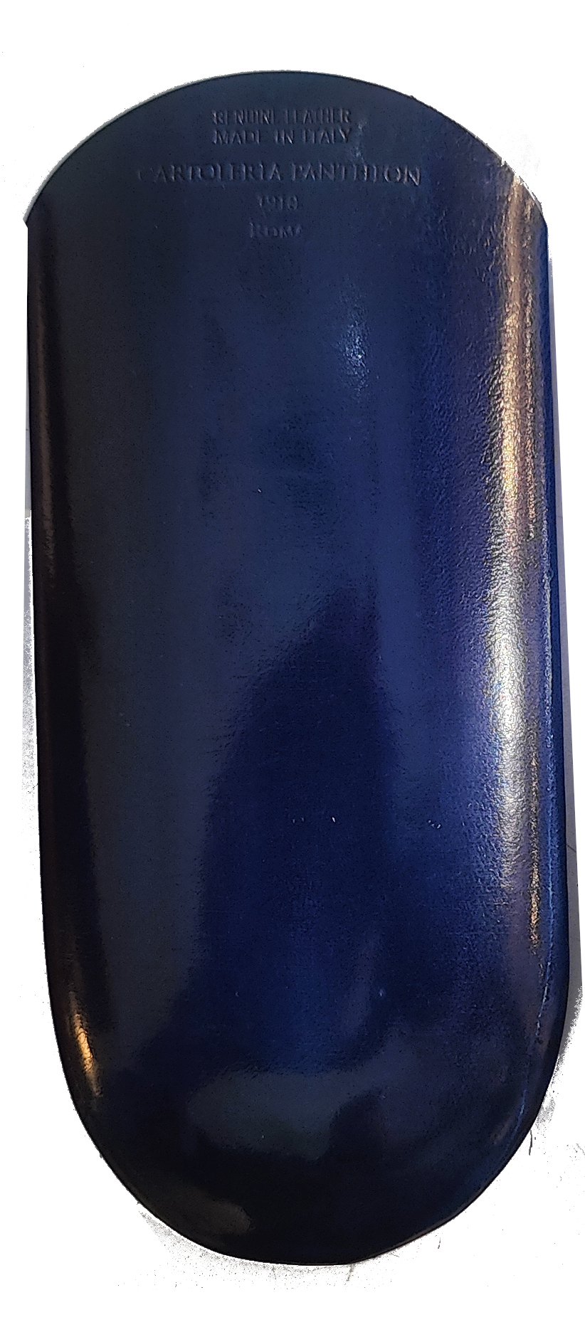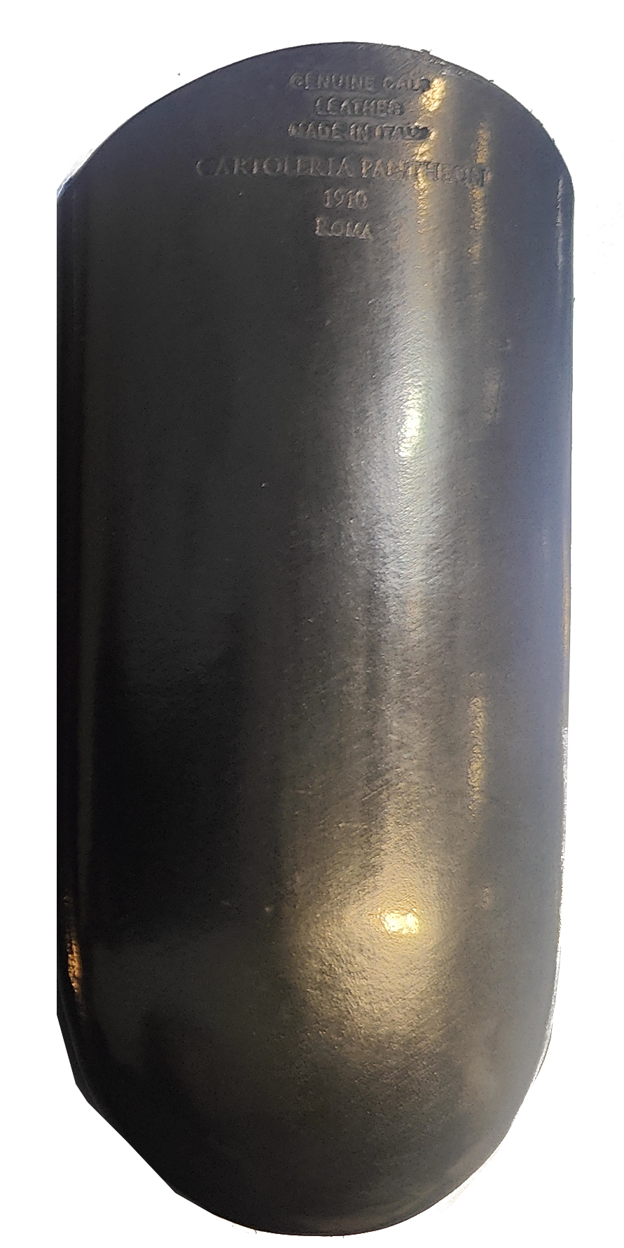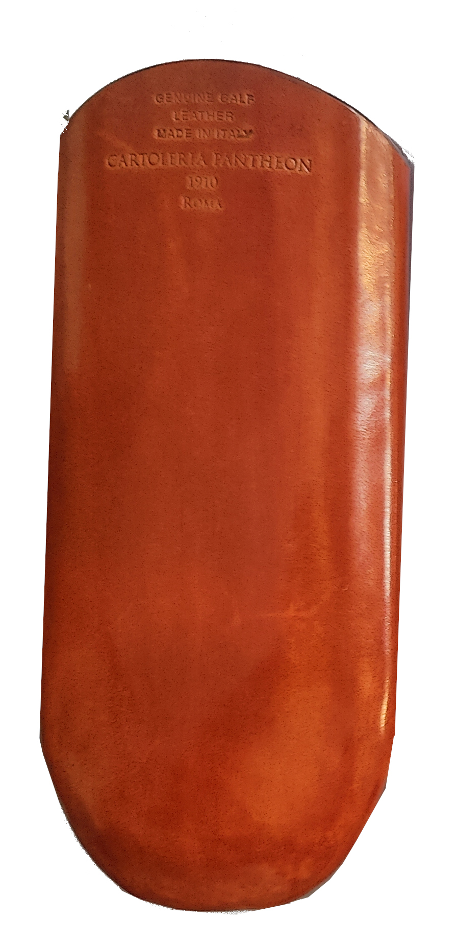 • Pelle di vitello pieno fiore conciata al vegetale, disegnato e realizzato a mano partendo dall’asciugatura della pelle a mezzo di una forma in legno che dona  la particolare forma arrotondata all’oggetto;